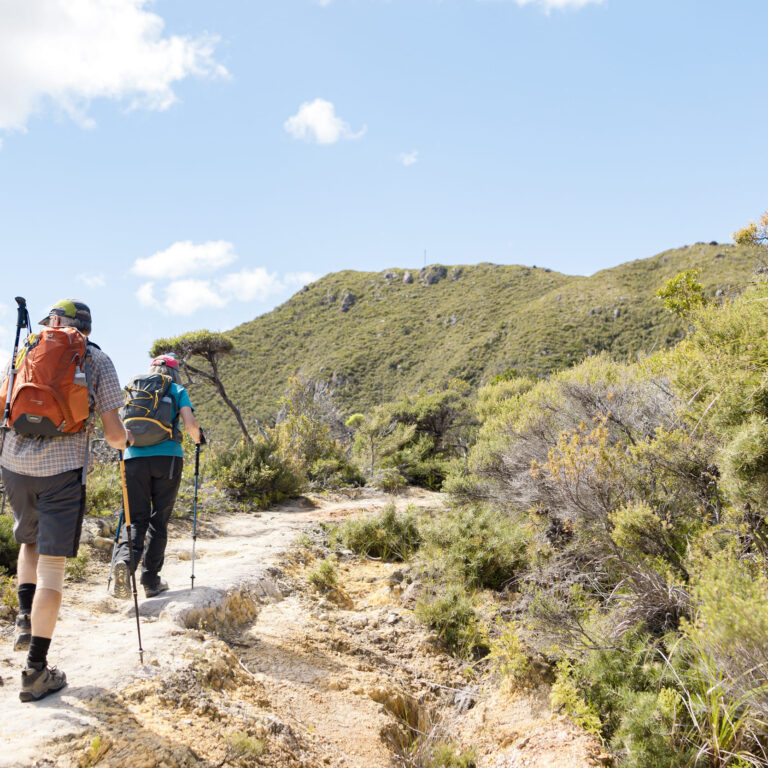 We meet at Claris Airport around 10:30 am, ready to begin our island adventure. Our first walk takes us up Te Ahumata/White Cliffs Track, following an old mining road lined with windswept vegetation and rare orchids. From the summit, we enjoy panoramic views across the island before descending to explore Blind Bay or visit Kauri Falls for a refreshing swim. Later, we settle into our lodge overlooking Whangaparapara Harbour, relax with a grazing platter, and enjoy a two-course Kiwi-style dinner as the sun sets.