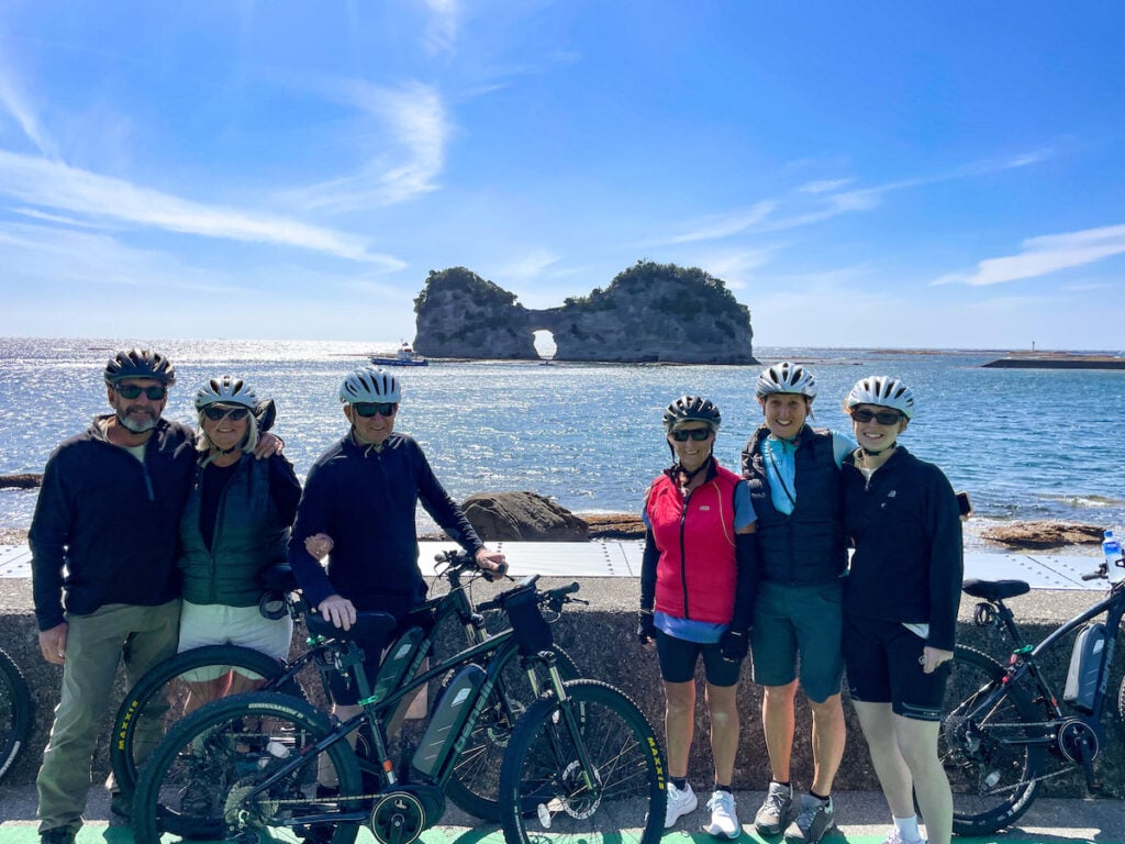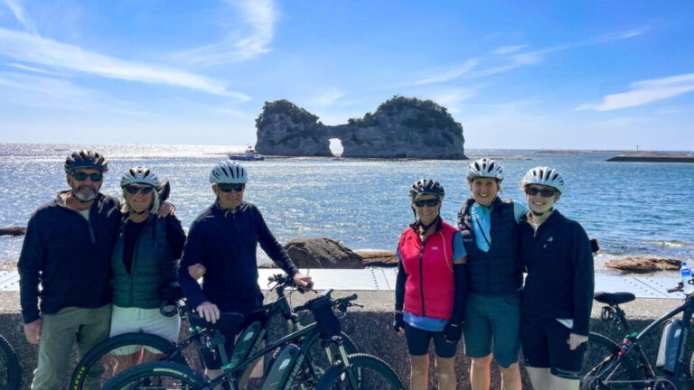 We leave Shirahama and ride toward the sacred mountains of Kumano along the Nakahechi route—one of the ancient Kumano Kodo pilgrimage paths—passing through historic sites and gradually climbing into the revered Kumano Sanzan, the Three Grand Shrines of Kumano. After lunch with a mountain view, we swap bikes for boots and set off on foot deep into the forest. Ancient cedar trees line the way as we walk stone-paved paths, moss-covered steps, and old bridges, stopping at small roadside shrines called “oji” to hear stories of the pilgrims who walked this same route 1,000 years ago. We finish in the small town of Chikatsuyu Oji, a historic lodging stop for retired emperors and aristocrats on their way to Kumano.