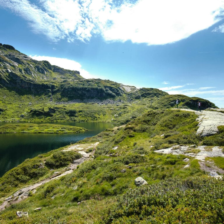 • Today we’ll be going to Lake Pormenaz. We’ll take the Route de la Côte until the first bend, and continue walking towards Gorges de la Diosaz, crossing the Souay torrent. We’ll go up, leaving the paths of the Tête de la Fontaine and the Bajulaz on the right, then follow a long, steep slope to a pyramid-marker to reach the Chalets des Alpages de Pormenaz. We’ll cross over towards the Chalets de Chavanne-Neuve and the peak Pointe Noire de Pormenaz—where we’ll find some geological curiosities— and then go to the Lac de Pormenaz.
