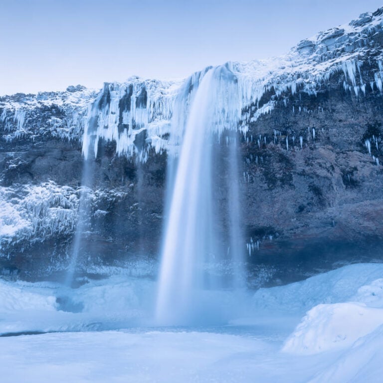 • Today we drive toward Iceland’s South Coast, beginning with the Sólheimajökull glacier where an unforgettable adventure awaits. Led by a certified glacier guide, we’ll explore a frozen wonderland of shimmering ice in shades of white, blue, and crystal clear. Along the way, you’ll safely view deep crevasses, water cauldrons, and other fascinating glacier features while learning about their formation and connection to the surrounding volcanoes and mountains. After this thrilling experience, we continue east to visit the dramatic black sand beach of Reynisfjara. On the return to our hostel, we stop to admire the stunning waterfalls Skógafoss and Seljalandsfoss. Dinner and overnight at the hostel. In the evening, we’ll keep watch for the Northern Lights. Dinner will be at the hotel or at a local restaurant.