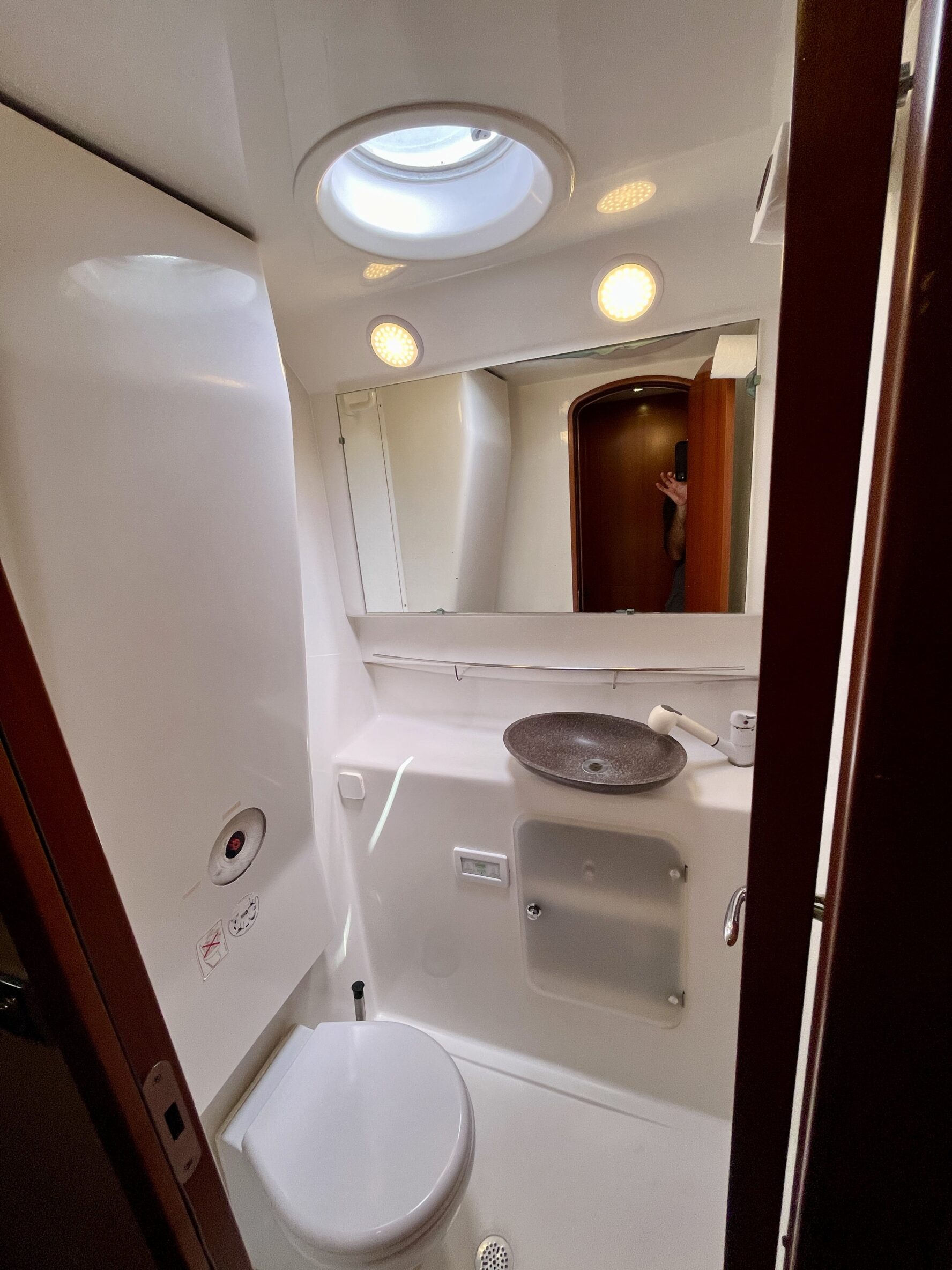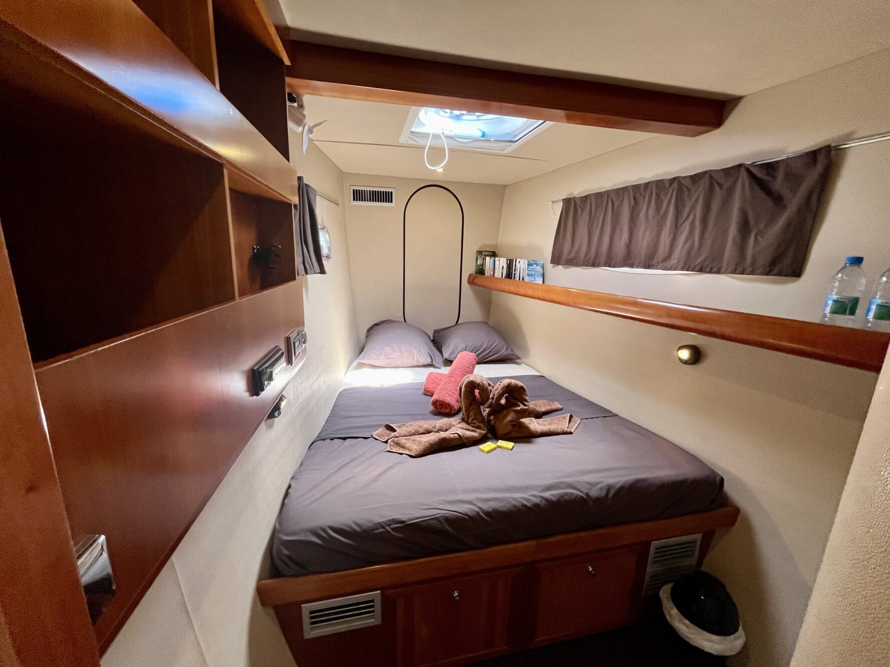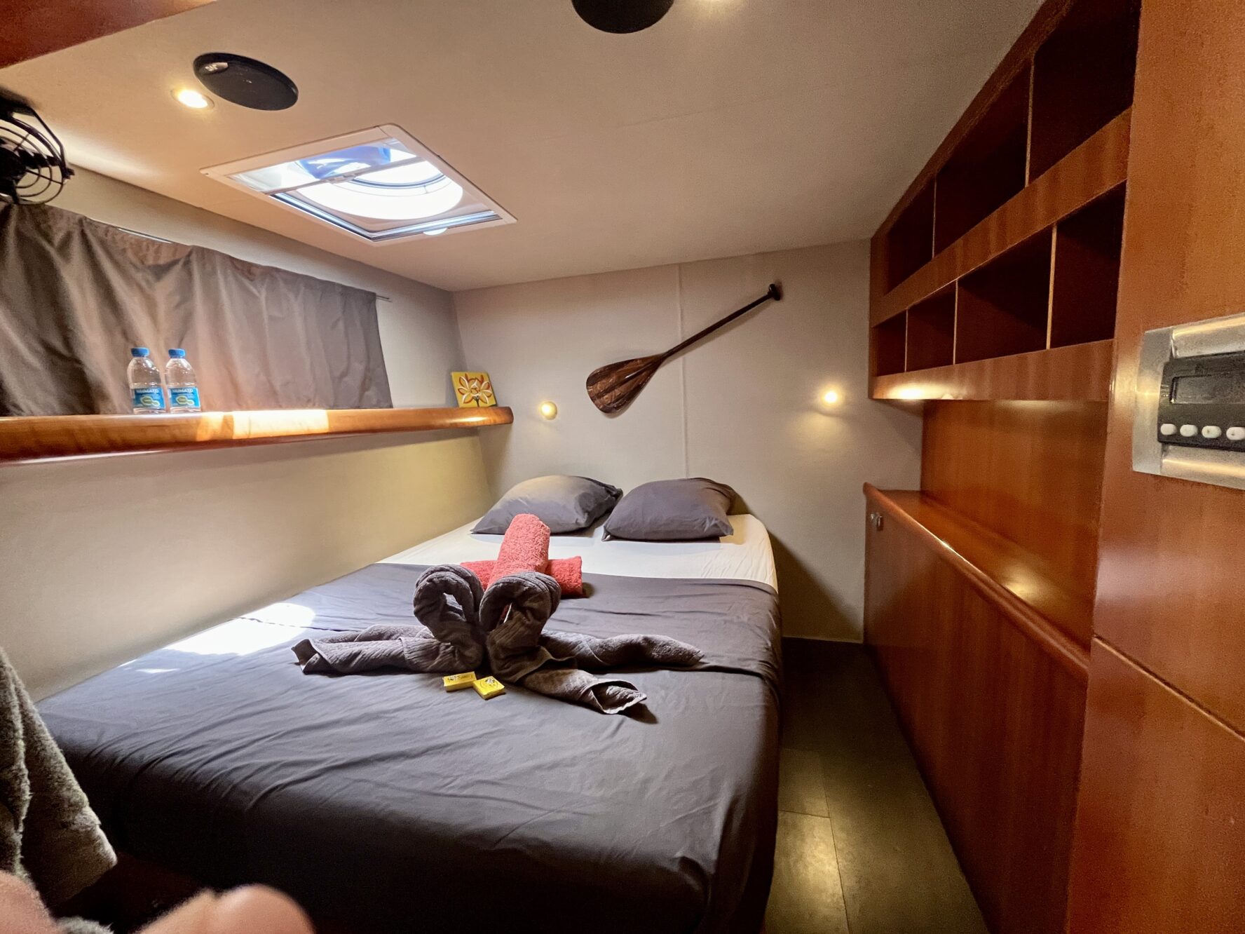 The “cat” contains 4 well-appointed cabins: 2 deluxe double