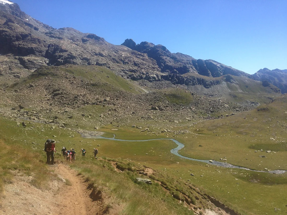 From the refuge, your hiking on the fourth day starts with a climb to the Vallon delle Pisse. The route follows the waterfall underneath the glacier of the Piramide VIincent, one of the smaller peaks of the Monte Rosa Massif. After passing the cable car station at Alpe la Balma, take on a steep and rugged path over the Bocchetta delle Pisse, followed by a descent to Alpe Pianlunga. Another winding ascent takes your group through the Valle d’Olen, then back down to the refuge at Lake Gabiet, your accommodation for the night.