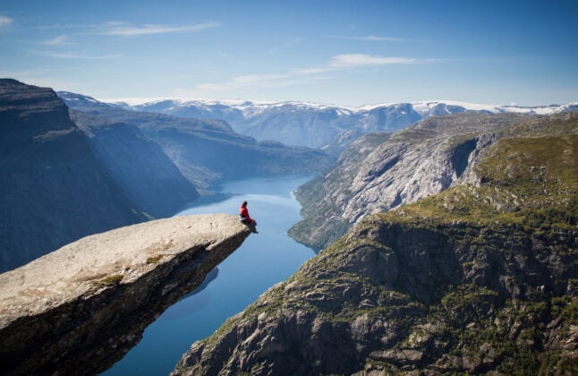Norway's Trolltunga hike is one of the most epic in the world….The hike takes you to a long piece of stone sticking out over a huge drop to the ground that's a dramatic backdrop on its own, but also offers one of the most dramatic spots for a photo!