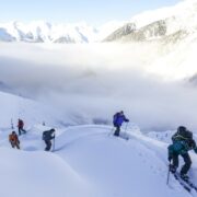 - Alpine touring skis, telemark skis or splitboard with skins (can be rented)