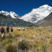 Take the last look back to the stunning granite walls of Punta Union Pass and continue the hike along an area of loose sand and rock—the result of recent floods. An avalanche some years ago broke an ice dam that held back the waters of the small Laguna Arteson Bajo. The resulting flood partially wiped up the trail, which is now altered in some parts. Today’s section passes Lake Jatunchocha (12,749 ft / 3886 m). Spend a laid back afternoon lounging by its shores or even going for a swim in its cool waters. Hike some more to Llamacorral (12,335 ft / 3760 m), a grassy field surrounded by boulders where you will stay for the night.