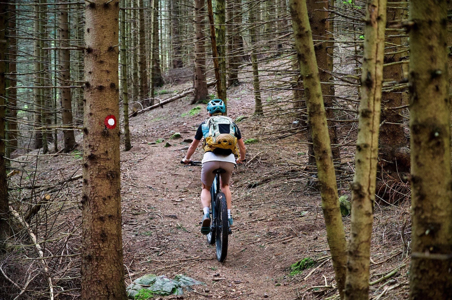 When I guide mountain bike tours in the Alps, we often cover 40 to 50 km (25 to 31 mi) per day with 1,200 to 1,500 m (3,900 to 4,900 ft) of climbing. It is real mountain terrain. You work for the views. And when you stop at the top, you understand exactly why you climbed.