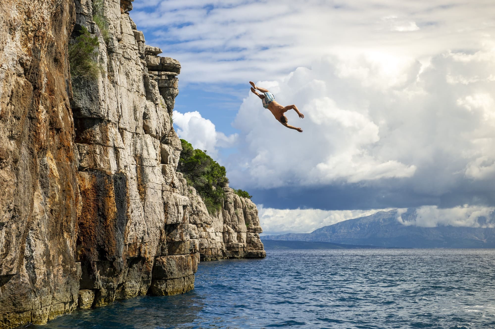 Dalmatia is where this collision feels the most dramatic. The mountains don’t politely fade into the sea. They drop into it. White limestone walls rise straight out of turquoise water. Old stone houses sit below cliffs that look like they were designed by climbers.